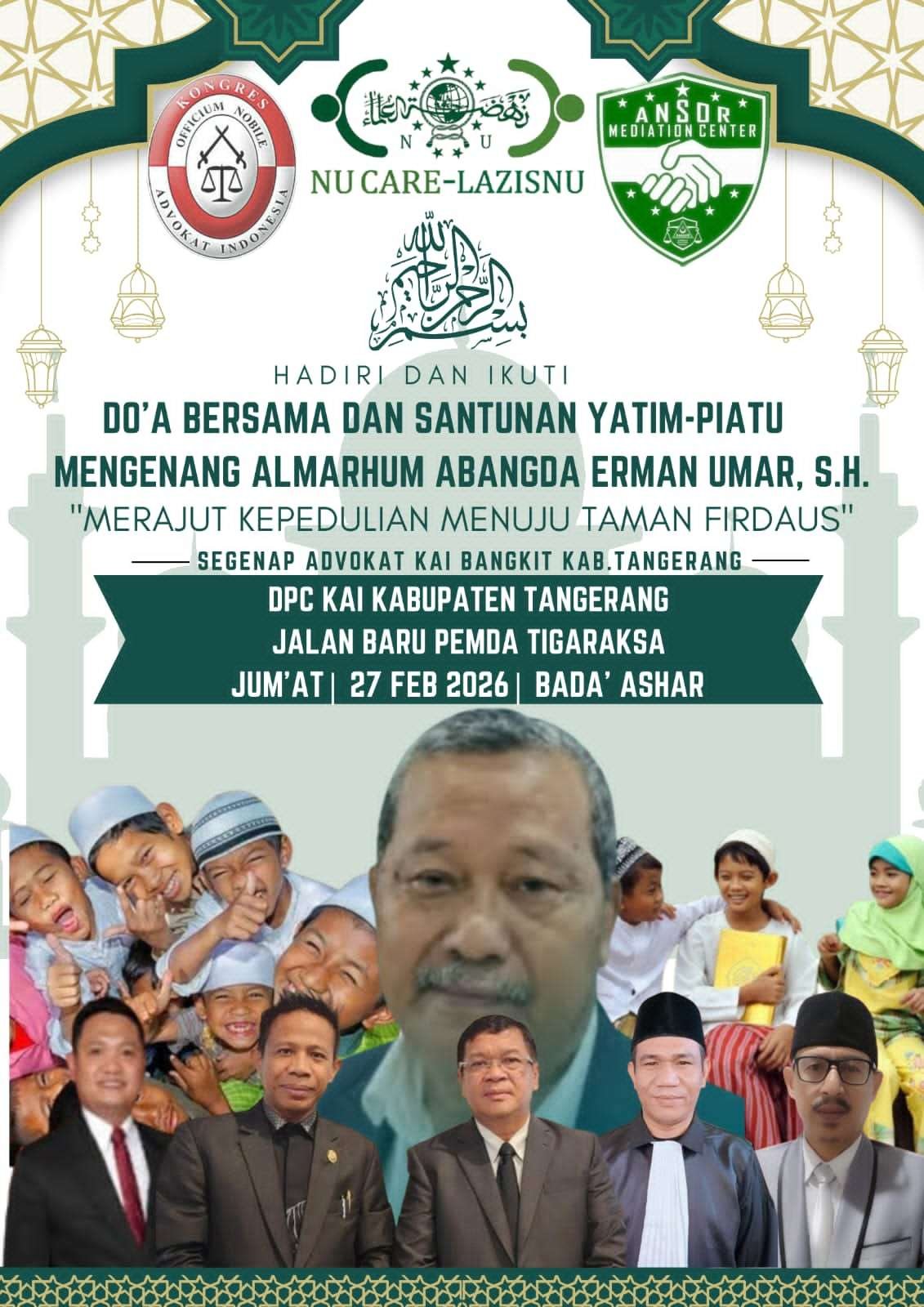 Kegiatan dimulai Kajian Rutin Tahsin, Hadits Arba’in, Riyadhus Shalihin, Tafsir Jalalain, Tausiyah di sampaikan oleh DR (C) Haji Hulia Syahendra, SH., MH., dimulai Pukul 14.00-20.00 WIB. Kegiatan dihadiri para Advokat KAI Bangkit se-Kabupaten Tangerang. Santunan diberikan untuk 50 anak yatim dan piatu, sekaligus Buka Puasa Bersama serta Do’a untuk Tokoh Senior Almarhum Erman Umar, SH., yang di support oleh Dr. Nasrulloh Nawawi, SH., MH., terpilih sebagai Presiden Kongres Advokat Indonesia (KAI) periode 2024–2029 dalam Kongres IV KAI di Surabaya, 30-31 Mei 2024.
