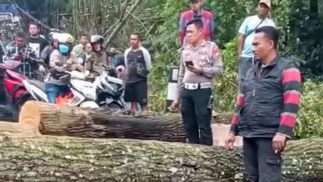 Bersama unsur terkait dan warga sekitar, petugas kemudian memotong serta menyingkirkan batang pohon dari badan jalan hingga arus lalu lintas kembali normal.